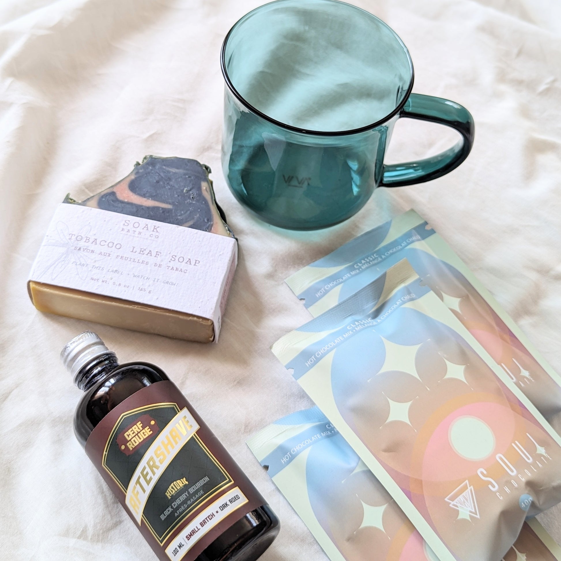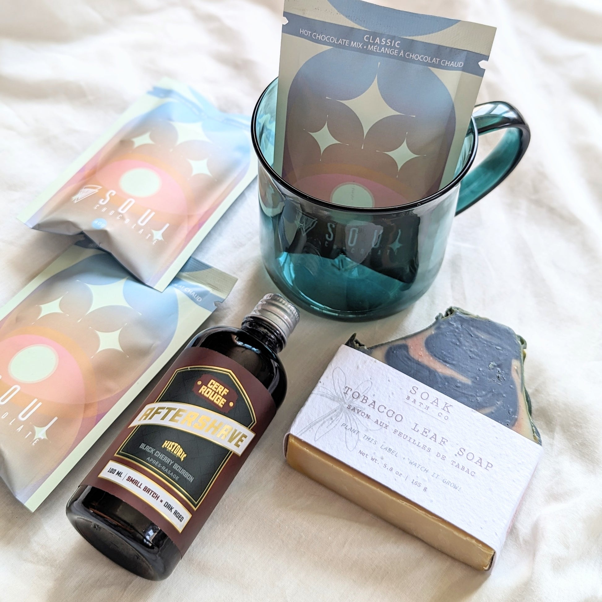Finally, a collection For Him! Grab this unique 6-piece gift for the guy in your life who appreciates a bit of self care, smelling good, and a mug of his favourite coffee, tea, or in the the case of this collection, delicious instant cocoa!