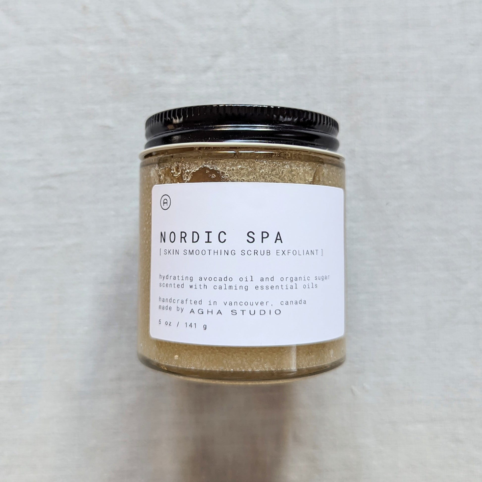Nordic Spa Skin Smoothing Scrub: A refining blend of organic sugar, nourishing plant oils, and pure castile soap, crafted for both face and body. Massage onto damp skin in circular motions. As the sugar dissolves, allow the foaming lather to refresh and cleanse. Rinse thoroughly. Use clean, dry hands or a spatula to preserve freshness. Best used within 3 months of opening. Ingredients: Organic sugar, avocado oil, olive oil, castile soap, essential oil blend, natural additives (clays)