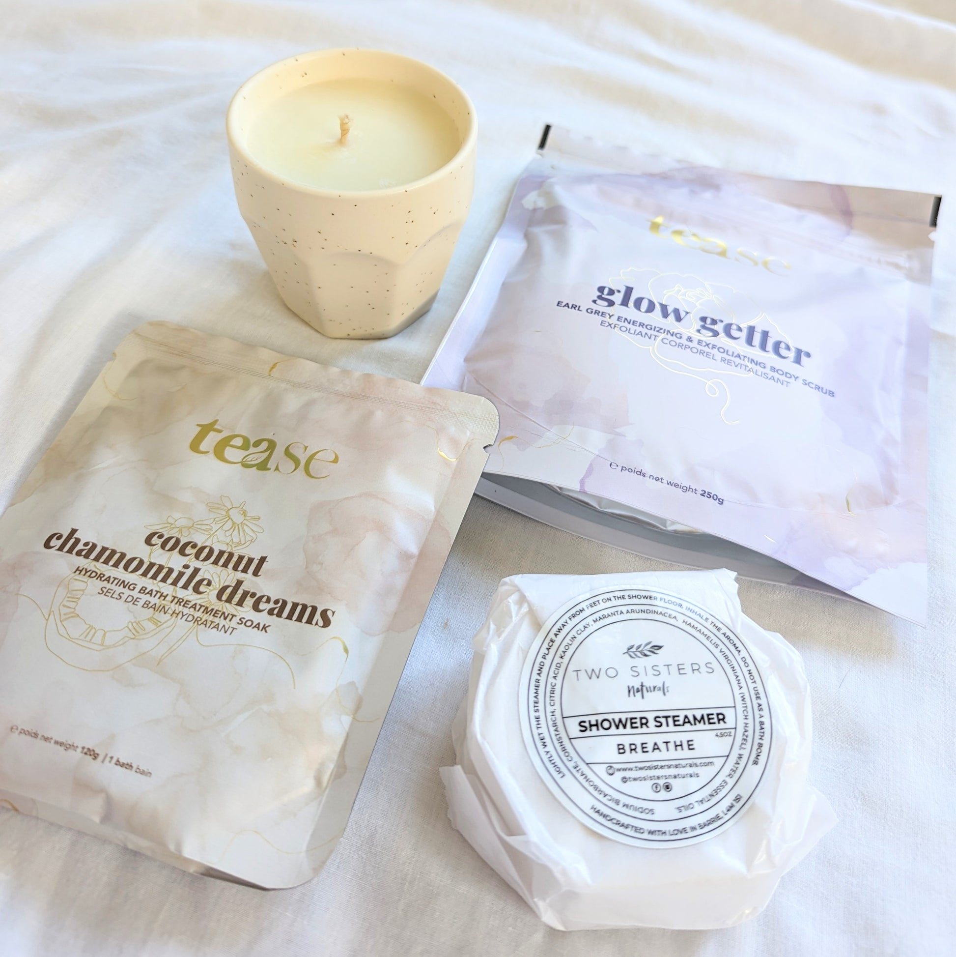 Whether it’s soaking in the bath or steaming in the shower, this 4-piece collection of skincare and body products will help you create your own spa experience at home.