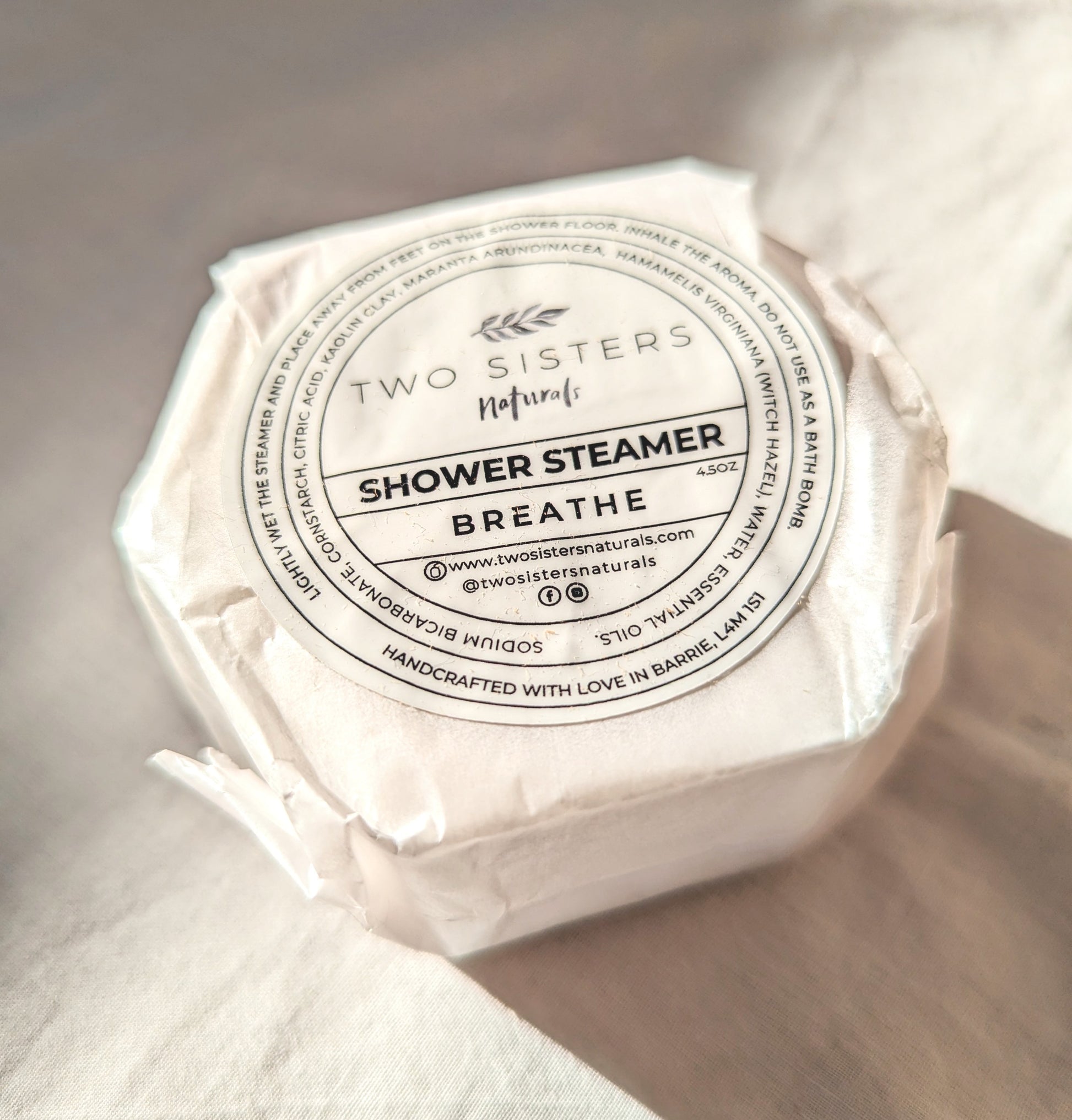 Shower Steamer: Take your shower to the next level with this aromatherapy powerhouse. Place on the ledge of the shower away from the water and let the steamer work its magic. Note: Do not immerse in bath or apply directly to skin. Ingredients: Sodium Bicarbonate, Cornstarch, Citric Acid, Kaolin Clay, Maranta Arundinacea, Menthol Crystals, Hamamelis Virginiana (Witch Hazel) Water, Therapeutic Grade Essential Oils.