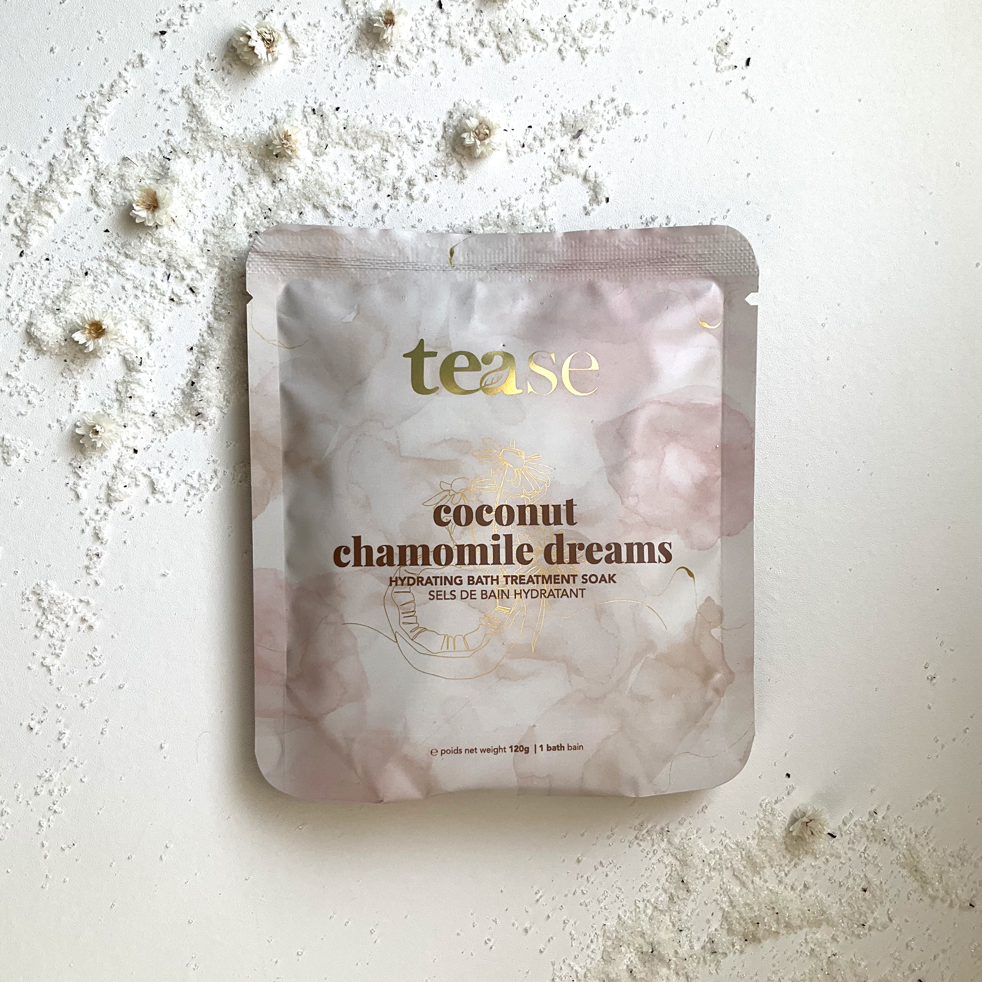 Coconut Chamomile Dreams Bath Soak: Slip into this luxe hydrating bath treatment made with ethically sourced organic Egyptian chamomile flowers and creamy coconut milk. Ideal for a pre-bedtime ritual. Ingredients: Sodium Bicarbonate, Sodium Chloride (Dead Sea Salt), Citric Acid, Magnesium Sulfate (Epsom Salt), Sodium Lauryl Sulfoacetate, Kaolin Clay, Prunus Amygdalus Dulci, Cocos Nucifera (Coconut) Oil, Cocos Nucifera (Coconut Milk), Anthemis Nobilis (Roman Chamomile) Essential Oil, Lavandula Angustifolia Flower Oil, Matricaria Recutita (Chamomile) Flower, Aloe Barbadensis Leaf Juice.