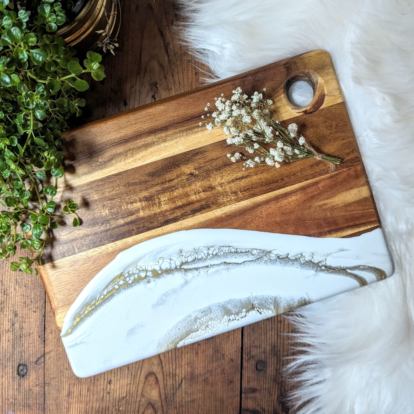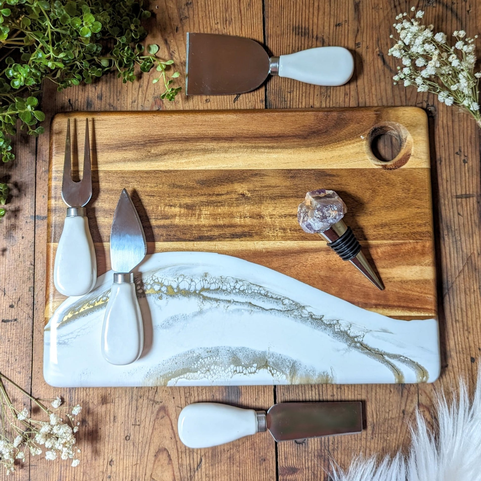 Acacia Cheese Board: Hand-made from high-quality Acacia hardwood and an eco-friendly resin creates a one-of-a-kind piece of serveware for your home. Hand-wash only. Cutting on resin surface not recommended. Avoid placing hot items on resin. Size: 11"x8"