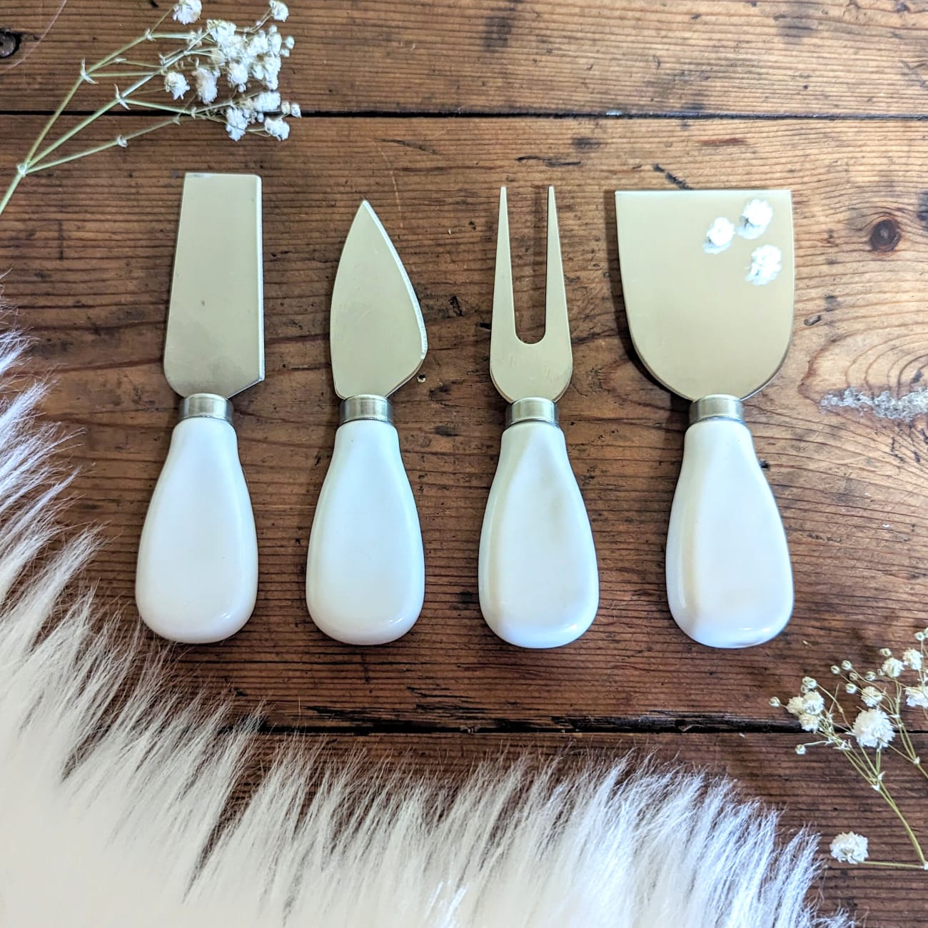 Ceramic Cheese Knife Set: These beautiful cheese knives are made from high quality stainless steel and come with a white ceramic handle and packaged together in an elegant black gift box. Great for all types of cheeses; hard, firm, semi-soft and crumbly. Hand-wash only.